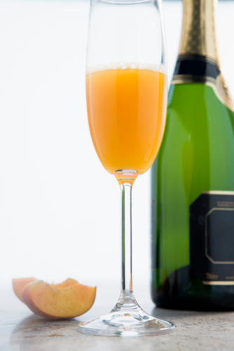 Ingredienti: 2 parti di succo di pesca non zuccherato quattro parti di Prosecco (o spumante brut), uno spruzzo di granatina (facoltativo) e una fettina di pesca per decorare.